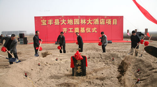 2013年3月18日上午,在县产业集聚区,鞭炮齐鸣,彩旗招展,宝丰大地园林大酒店项目正式开工奠基。县领导刘书锋、张庆一、梅玉三、铁干卿、赵二成、副县级干部李自钦等分别参加仪式并为项目开工培土奠基。县长张庆一致辞。县委常委、常务副县长李留军主持开工仪式。集团领导张怀平、张彪、王福文等参加。 张庆一说,我县第三产业发展前景广阔,服务业市场潜力巨大。万象城抢抓机遇,乘势而上,在此建设园林式酒店,对于填补宝丰五星级宾馆的空白,以及提升城市品位、完善城市功能、展示城市形象、推动商贸繁荣和优化经济结构,都具有十分重要的意义。希望相关职能部门要齐心协力,密切配合,促进项目快建设、快竣工、快见效,带动第三产业的快速发展。同时,希望项目施工单位科学管理,精心施工,高效推进项目建设,努力把大地园林大酒店打造成为优质工程、精品工程、标杆工程。 宝丰大地园林大酒店项目是大地集团根据企业发展需要,多元化发展,向“三产”业转移,投资新建的五星级酒店、水上乐园、员工社区等项目。该项目由中国建筑设计研究院设计,位于长安大道与省道豫02线交汇处,地处宝丰高新技术产业集聚区,前临应河,后依文峰公园,交通便利,位置优越。总占地面积100多亩,总建筑面积5万多平方米,预计总投资约3亿元。 此项目在推动宝丰县社会经济发展、完善城市服务功能等方面具有深远的战略意义。项目建成后将进一步提高平顶山、宝丰的城市品位和对外形象。