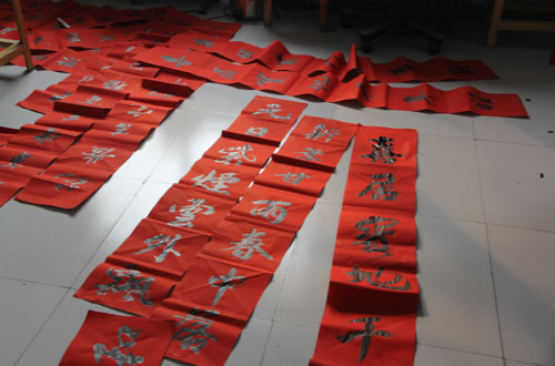 红春联,红笑脸。在义写春联现场,应广大员工所需,书法家们凝神静气,挥毫泼墨,挥就一幅幅笔酣墨饱、寓意深刻的新春佳联,大红的福字,吉祥的喜字,构成一道独特的年俗文化风景线。活动持续三个多小时,300多幅春联被大家一抢而空。