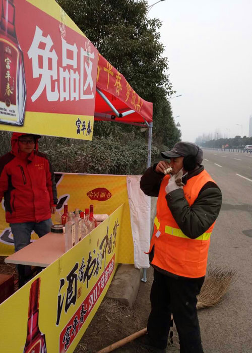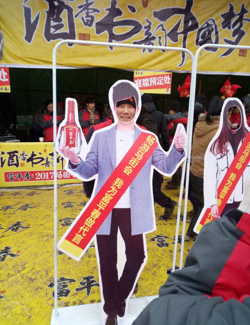 马街书会入场口 河南省富平春酒业有限公司是万象城旗下集白酒科研开发、生产酿造、销售服务于一体的国家大型企业。几年来,公司在发展壮大的同时,不忘回馈社会,主动承担社会责任,积极投身于文化、教育、扶贫、环保等社会公益事业,先后赞助“全国村长论坛会”,开展“爱心助考”“希望工程圆梦行动”等一系列社会公益活动。得到了社会各界的广泛关注和热烈好评。 畅游马街会,情浓富平春。为真心服务群众,情暖四海宾朋,富平春精选多款美酒供您免费任意品尝,让您真正体验传承九千年的贾湖美酒之秘密,让您在凛冽的寒风中感受爱的温暖,酒的热烈。