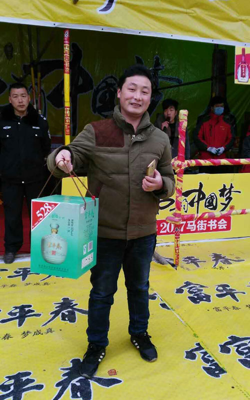 一位老人沉醉在品味美酒之中 同时,开展扫码抽大奖活动,共设置七个奖项,最高奖项为价值528元富平春尊品原浆一坛,数万份奖等你拿,综合中奖率达98%。书会现场开展的系列活动不断吸引着四面八方的来客蜂拥而来,扫码的、抽奖的、品酒的,火爆场面嗨翻天;开展你有宴席我送礼活动,凡在马街书会现场,预订2017年宴席活动的,当场送价值528元尊品原浆1坛,并有豪礼相送,不断为未婚青年送礼包,送惊喜,送实惠;开展停车送酒活动,为广大赶会群众提供停车点,每停一辆车送停车券一张,凭停车券可免费领取富平春F6一小瓶;开展金鸡迎春买赠酬宾活动。凡在马街书会期间,购买富平春华贵、F6、F3等酒品者,赠吉祥物金鸡一个,恭祝金鸡献瑞,新年大吉!……