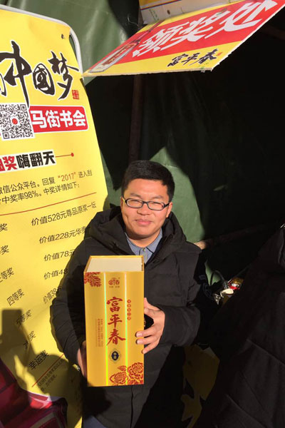 随着人群,笔者走进书会现场,大型彩虹门“富平春2017马街书会”欢迎着八方来客,“天地同唱马街书会,日月共醉富平春酒”等大红条幅格外引人注目,路两旁及书会现场挂满了大红的灯笼,这是富平春义务为书会做的精心布置,为书会增添了喜庆热烈的气氛。