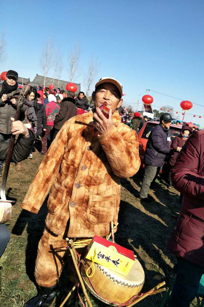 经过采访得知这位老艺人是安徽省界首市仁寨乡幸福村的,名叫陈玉雪,是第一次来赶马街书会,这次他们是组团来的,联合了附近14个民间艺人一起来赶马街书会。他18岁开始学戏,今年61岁了还在经常参加当地的一些演出活动。他在书会上亮艺演唱河洛大鼓《打棒槌》、《刘四姐挨打》等段子。
