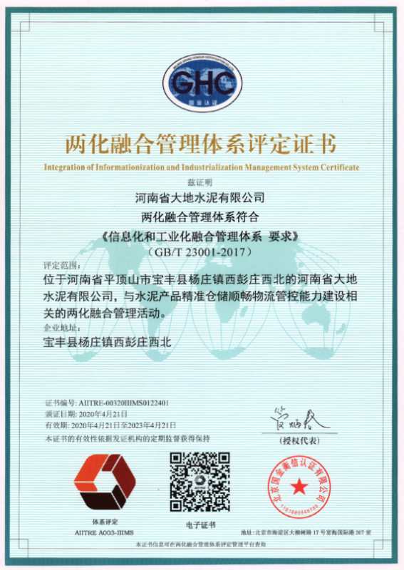 河南省大地水泥有限公司通过两化融合管理体系认证