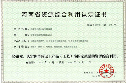 万象城(中国) >> 走进大地 >>资质荣誉 >> 河南省资源综合利用认定证书